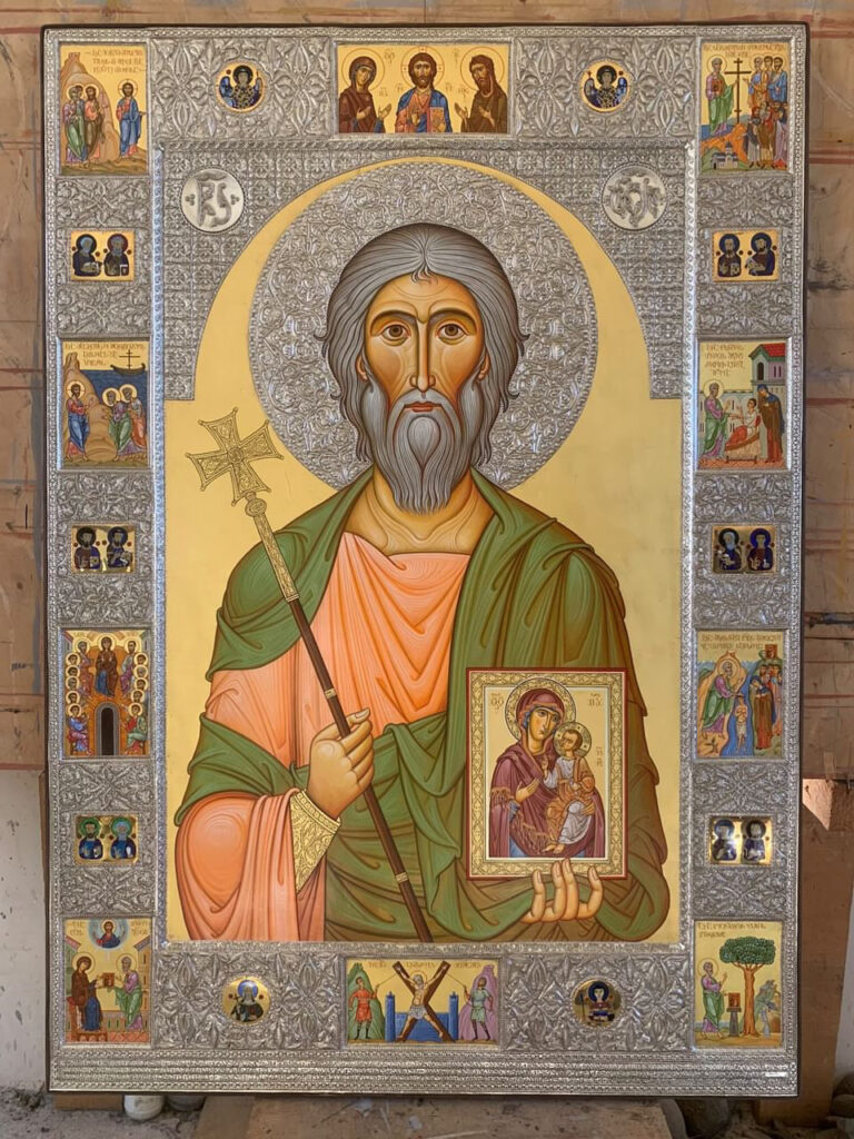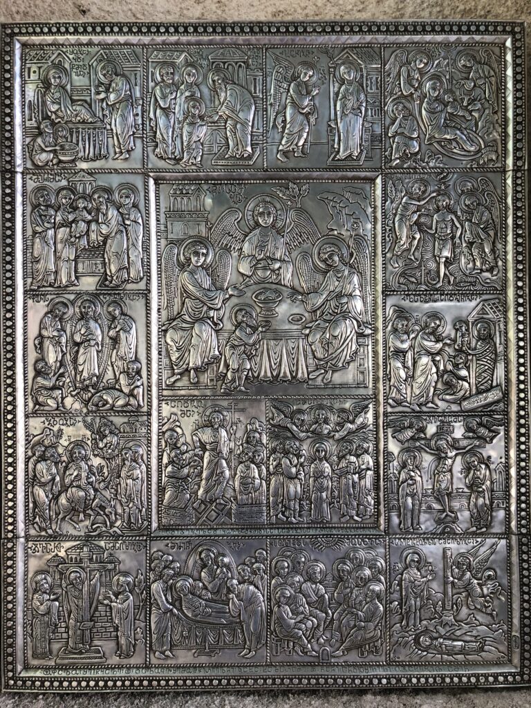 201. მამა გაბრიელის ლუსკუმისთვის მთავარი ხატი, ცხოვრების სცენებით და ტიხრული მინანქრით – ვერცხლი, 100/67 სმ.